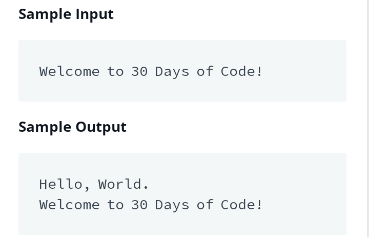 On the first line, we print the string literal Hello, World.. On the second line, we print the contents of the inputString variable which, for this sample case, happens to be Welcome to 30 Days of Code!. If you do not print the variable’s contents to stdout, you will not pass the hidden test case.